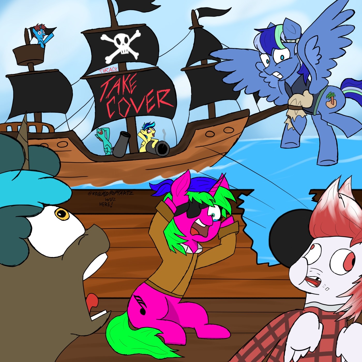 Blurain (Crows nest), Ocean Man (flying), Luck Rock (Laugh), Koa (yellow), Thrack (Pink), Canto (Scream), Jesh PK (Cannonball)