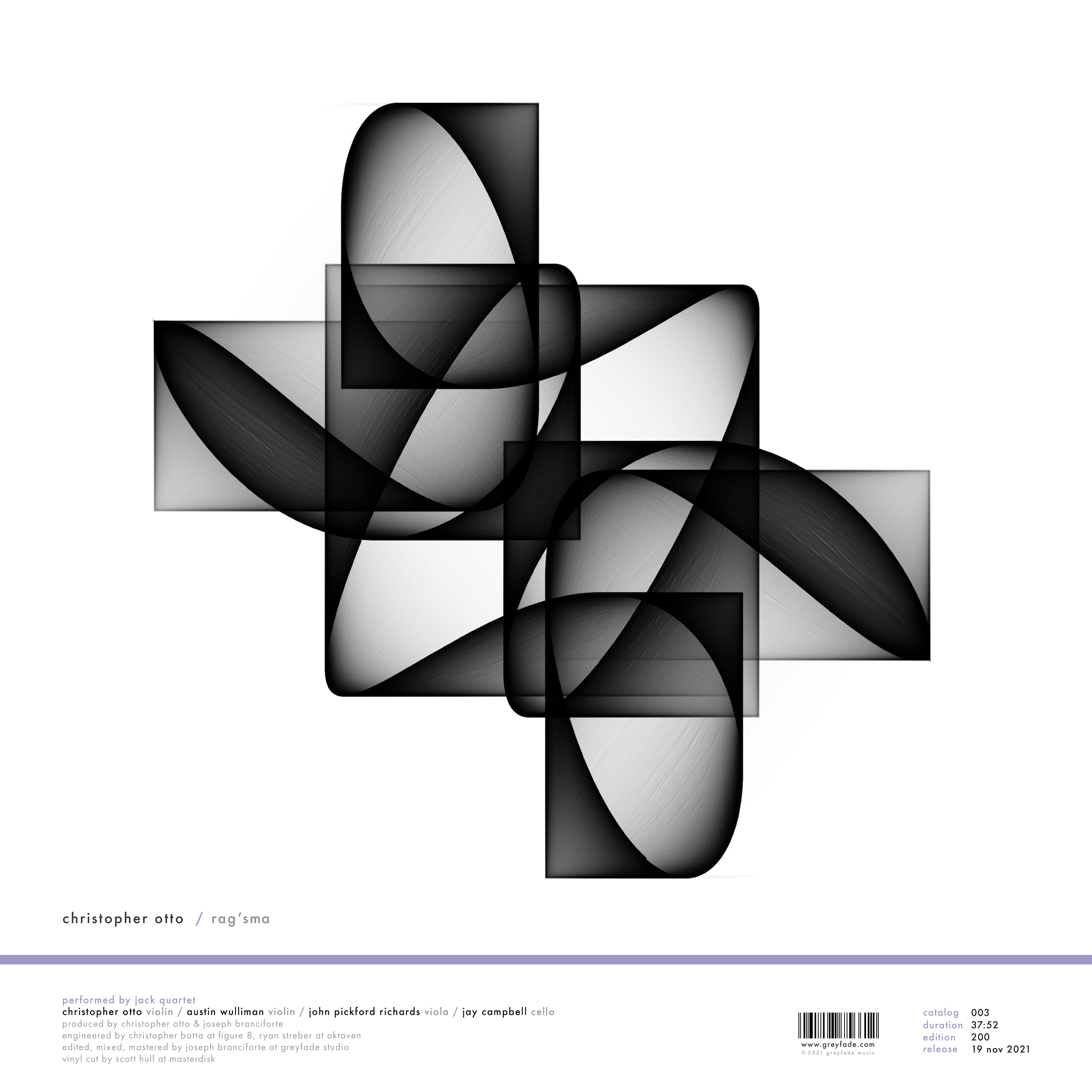 The full-length compositional debut of Christopher Otto, violinist and founding member of the internationally acclaimed JACK Quartet. With its exacting mathematical construction, a harmonic language bridging just intonation and triadic tonality, and a dazzling, immersive sound, rag'sma announces the arrival of an important new compositional voice. Recorded by JACK Quartet x 3.