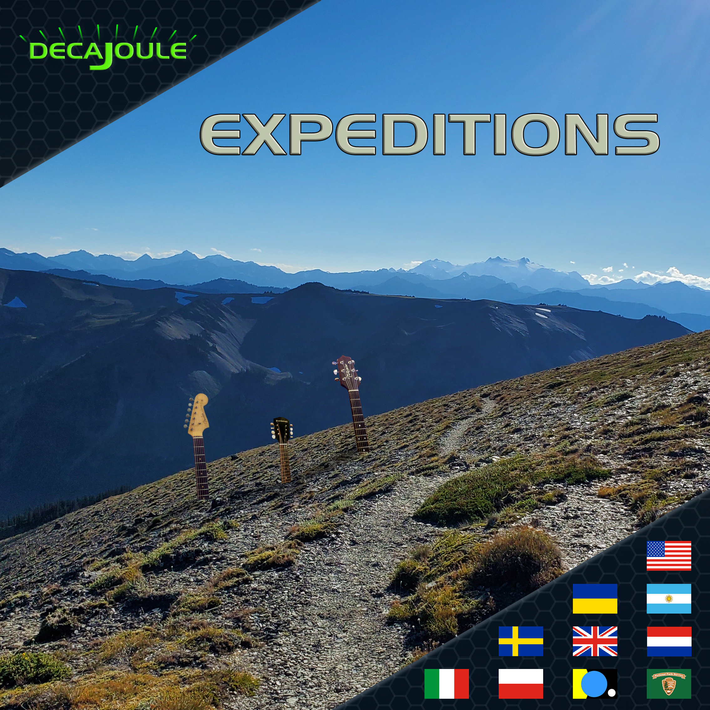 Other vocalists/musicians from the United States, Ukraine, Argentina, Sweden, United Kingdom, Netherlands, Italy, and Poland were hired on Fiverr. The flags on the album cover represent these locations. An Earth flag and National Park Service flag were included. The photo is from the trail junction near Maiden Peak in the Olympic Mountains.