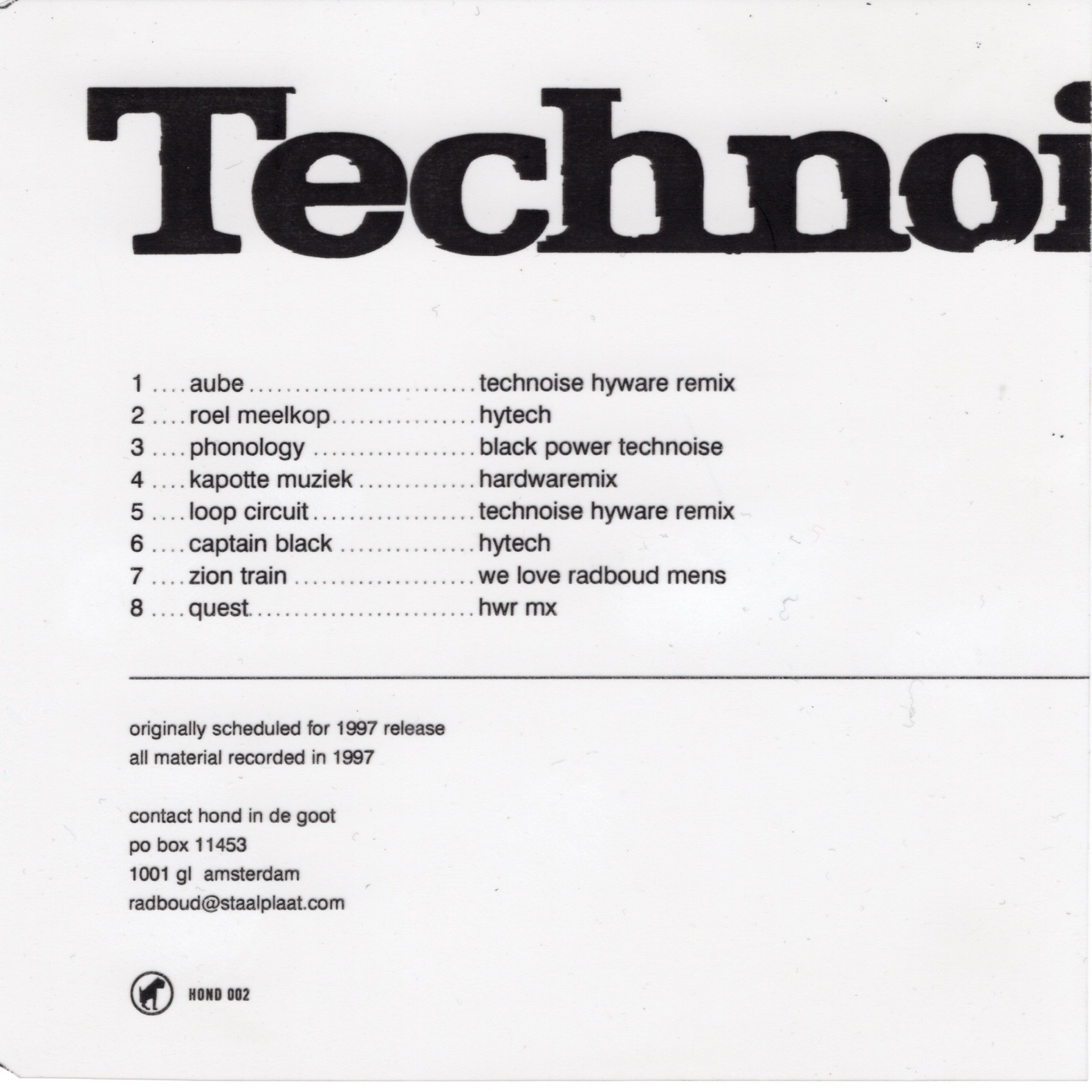 CD with remixes of tracks from Technoise. All material recorded in 1997.