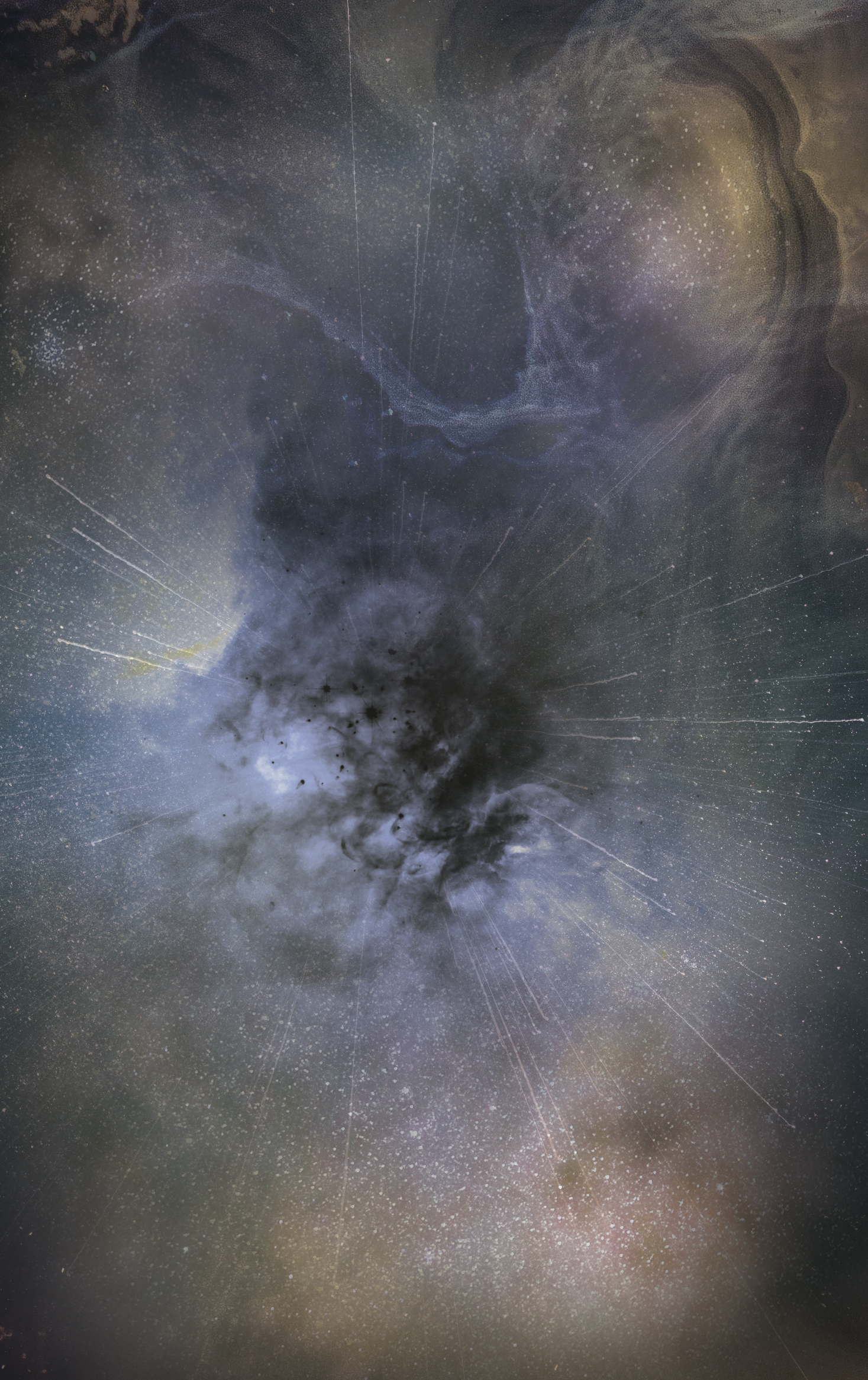 Deep purple and black rays, glowing at the same time, flood all directions of this door opening, an endless space, filled with pleasant gravitational forces that suspend and allow for freedom among this dark yet calming plane