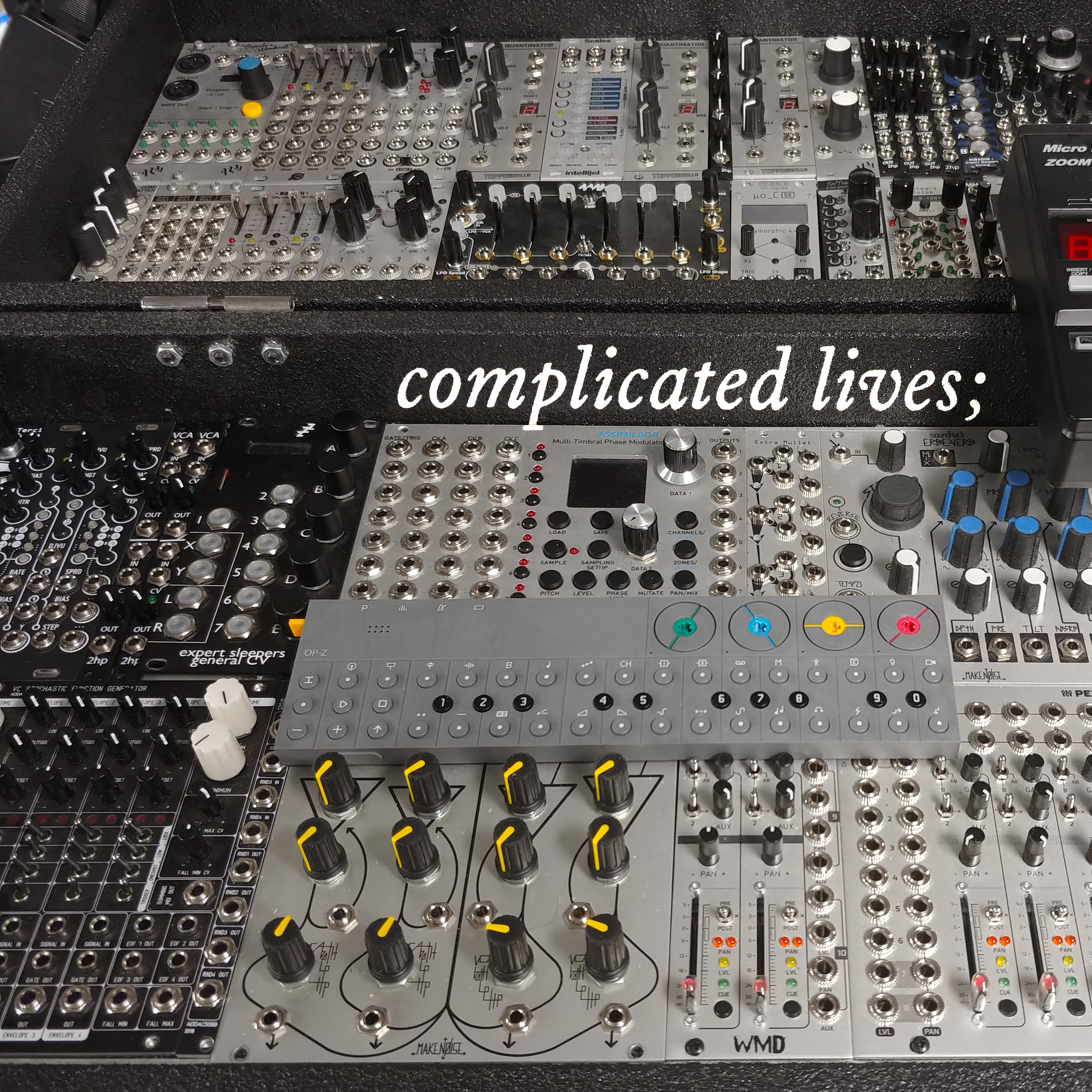 In addition, specific technical & resource-oriented thanks to Joseph/Jeannot & all @ 4ms (if you need a ringing endorsement for their SWN, this is it), Josh @ Topobrillo (ditto his Quantimator, of which there are 3x in use here), Devin/Walker @ MakeNoise, Andre @ ADDAC, David @ Bubblesound, and everyone else that made this particular setup a reality.