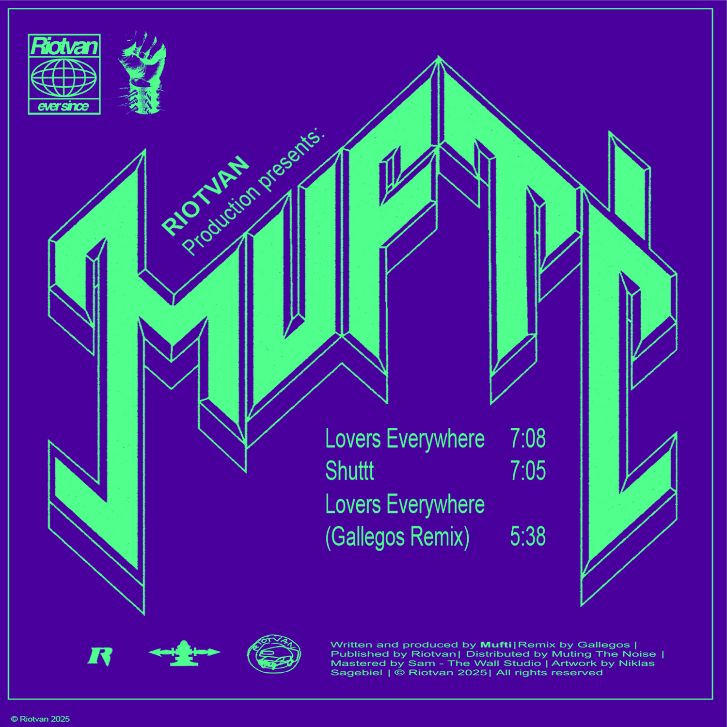 All songs written and produced by Mufti. Remix by Gallegos. Published by Riotvan. Distributed by Muting The Noise. Manufactured by Matter Of Fact. Mastered by Sam - The Wall Studio. Artwork & Layout by Niklas Sagebiel © Riotvan 2025. All rights reserved. Made in Germany.