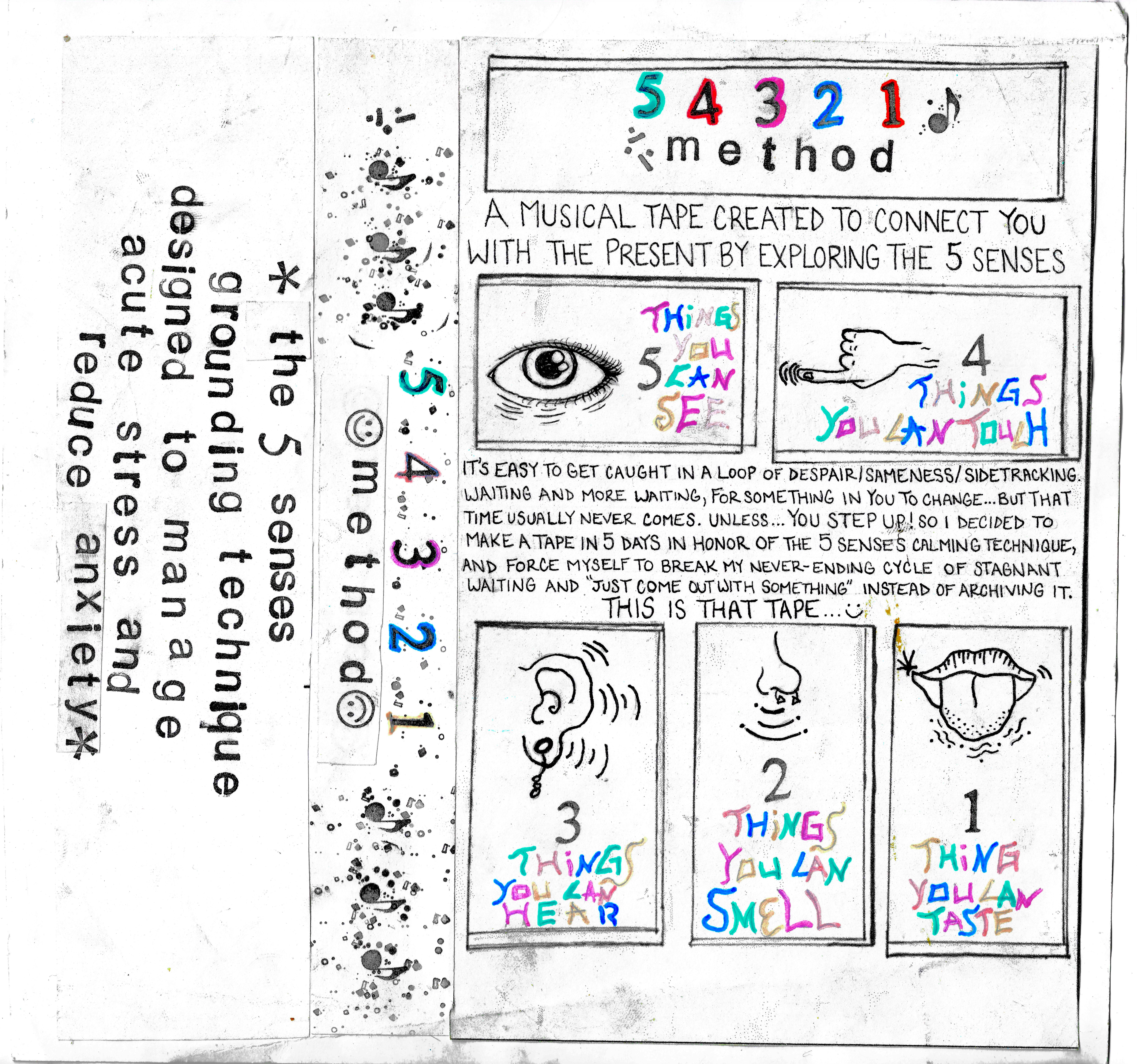 Explore your senses and connect yourself with the present with the 54321 Method! Each tape includes items designed to stimulate each of the 5 senses. Recorded in 5 days (May 2nd-7th, 2024) on a Tascam 424.