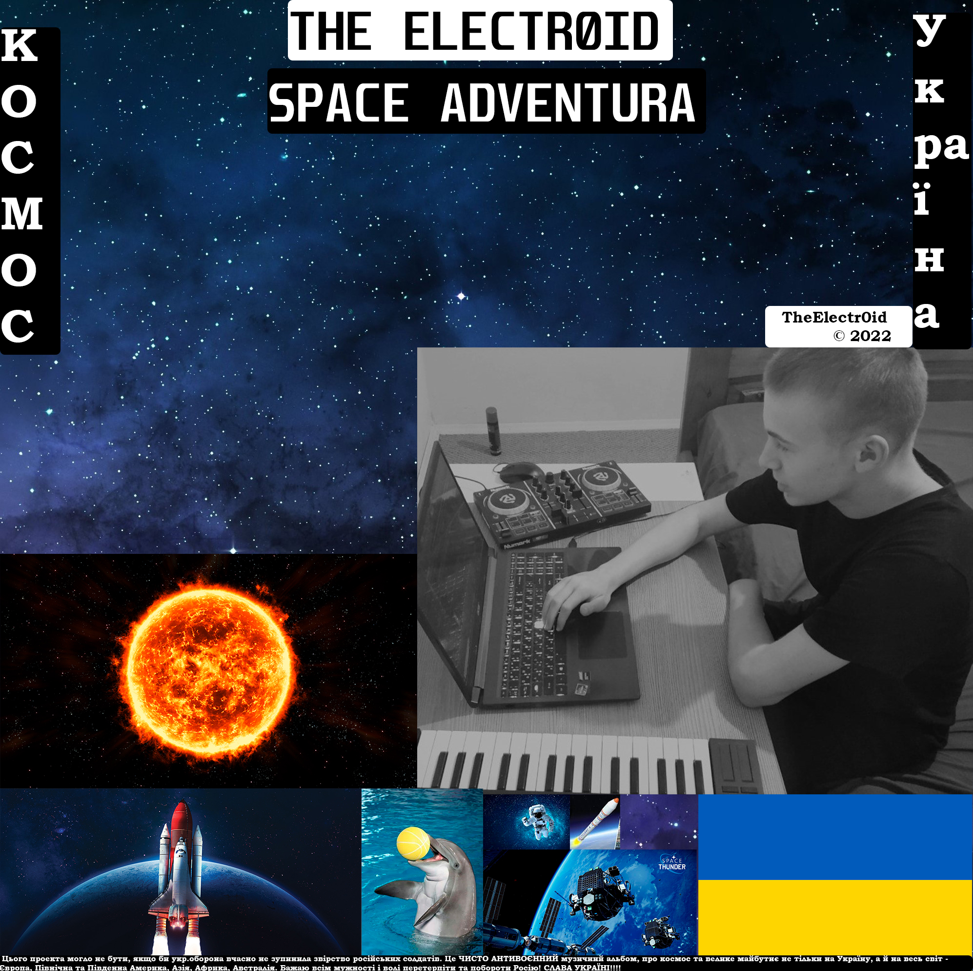 Space Adventura - альбом мого проекту TheElectr0id. Оцінювати звичайно вам, але як для мене, вийшов дуже атмосферний, мелодійний і мріючий техно-хаус-рейв альбом з невеликими експериментальними електроними звуками. Всім дякую, гарного дня, мирного неба над головою і СЛАВА УКРАЇНІ!!!