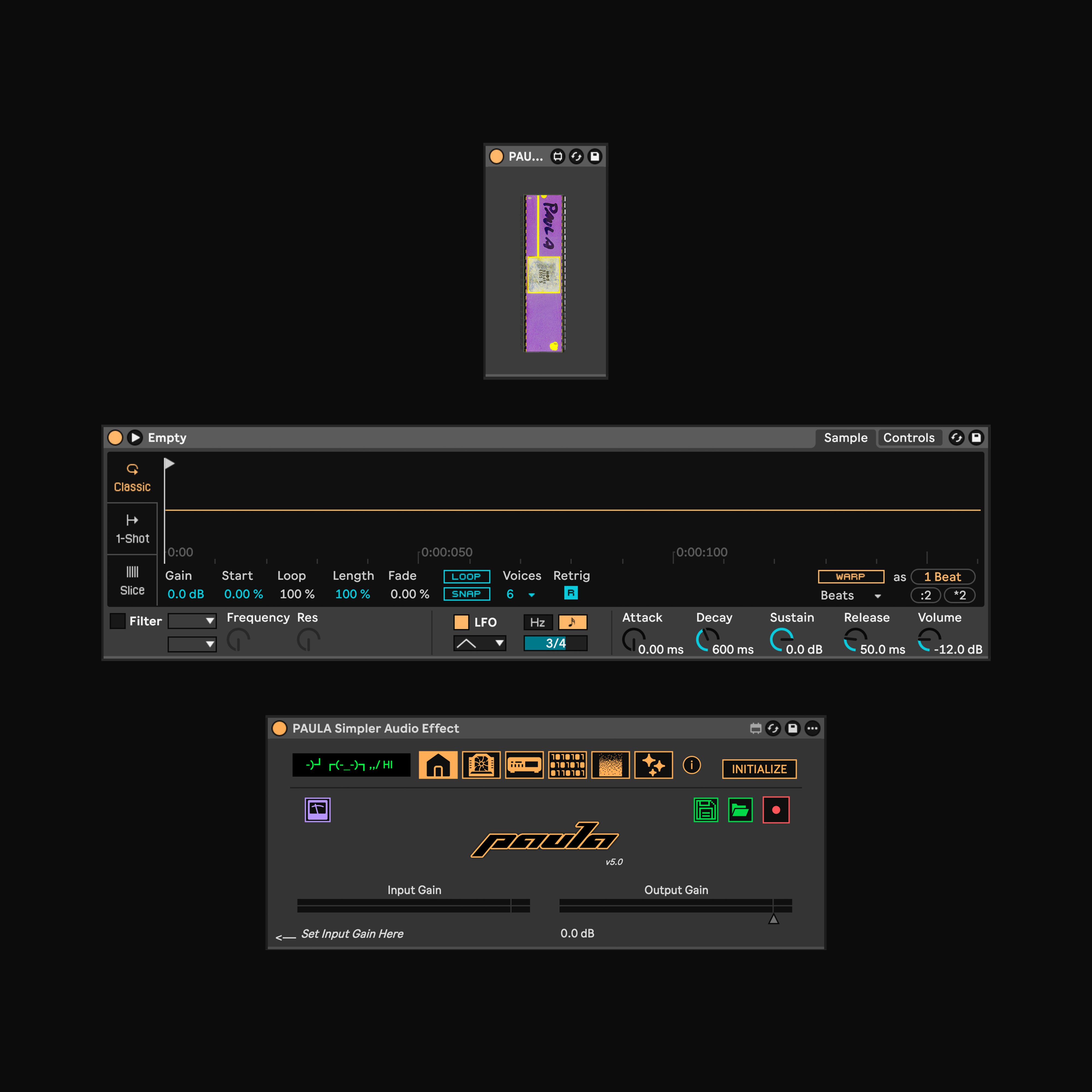 PAULA uses Max for Live, JavaScript and the Live API, and comes as three separate devices (.adg): PAULA Simpler, PAULA Sampler and PAULA Drum Sampler.